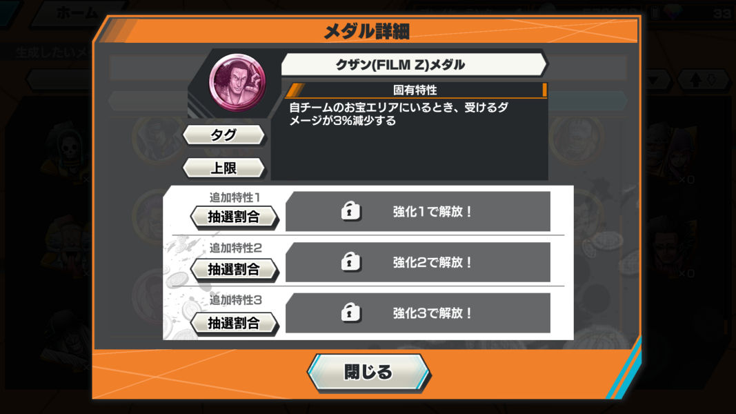 ![]() ボルサリーノメダル | お宝エリアにいるとき、受けるダメージが5%減少する | |