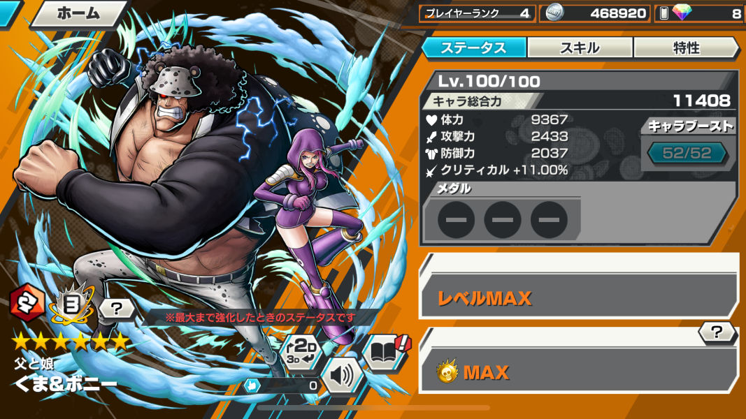 | 超人系能力者 | 合計Lv600 体力が50%以下のとき,クリティカルで与えるダメージを20%増加する |