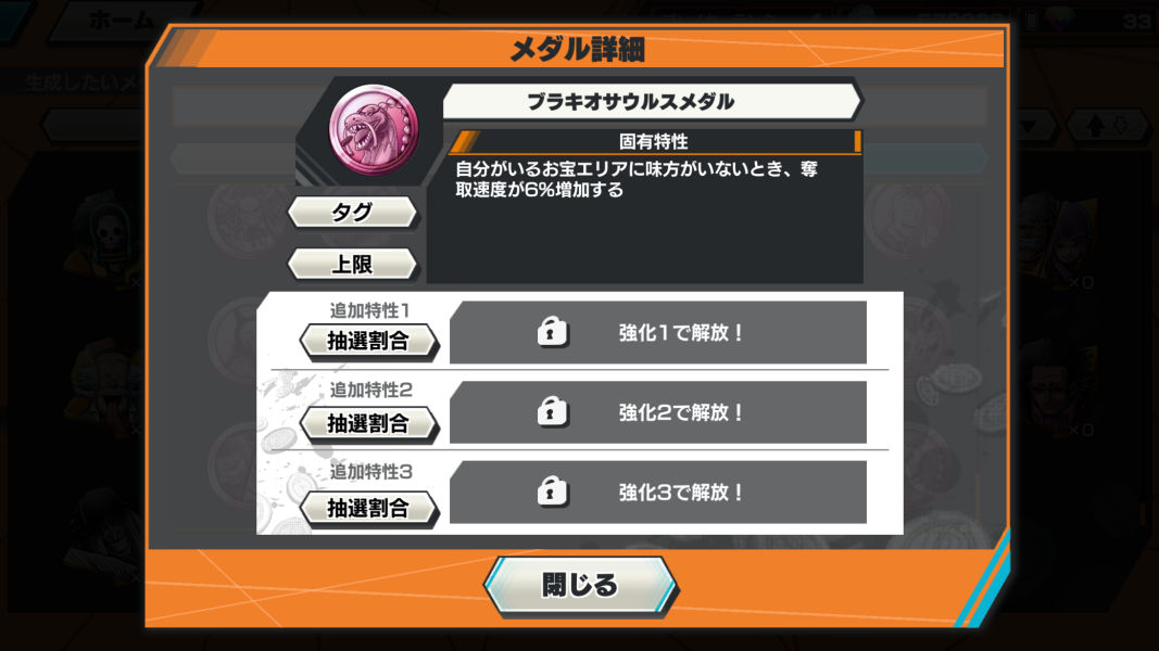 ![]() プテラノドンメダル | 体力が70%以上のとき、奪取速度が8%増加する | |