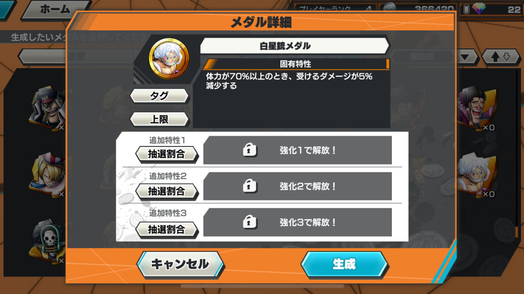 ![]() エッグヘッドチョッパーメダル | 体力が70%以上のとき、受けるダメージが5%減少する | |